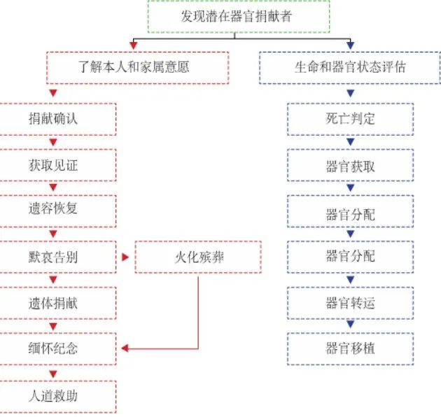 (3)紅十字會工作人員或協(xié)調(diào)員會和患者的近親屬聯(lián)系、溝通,詳細介紹人體器官捐獻的相關(guān)事宜,尊重近親屬對器官捐獻的決定;