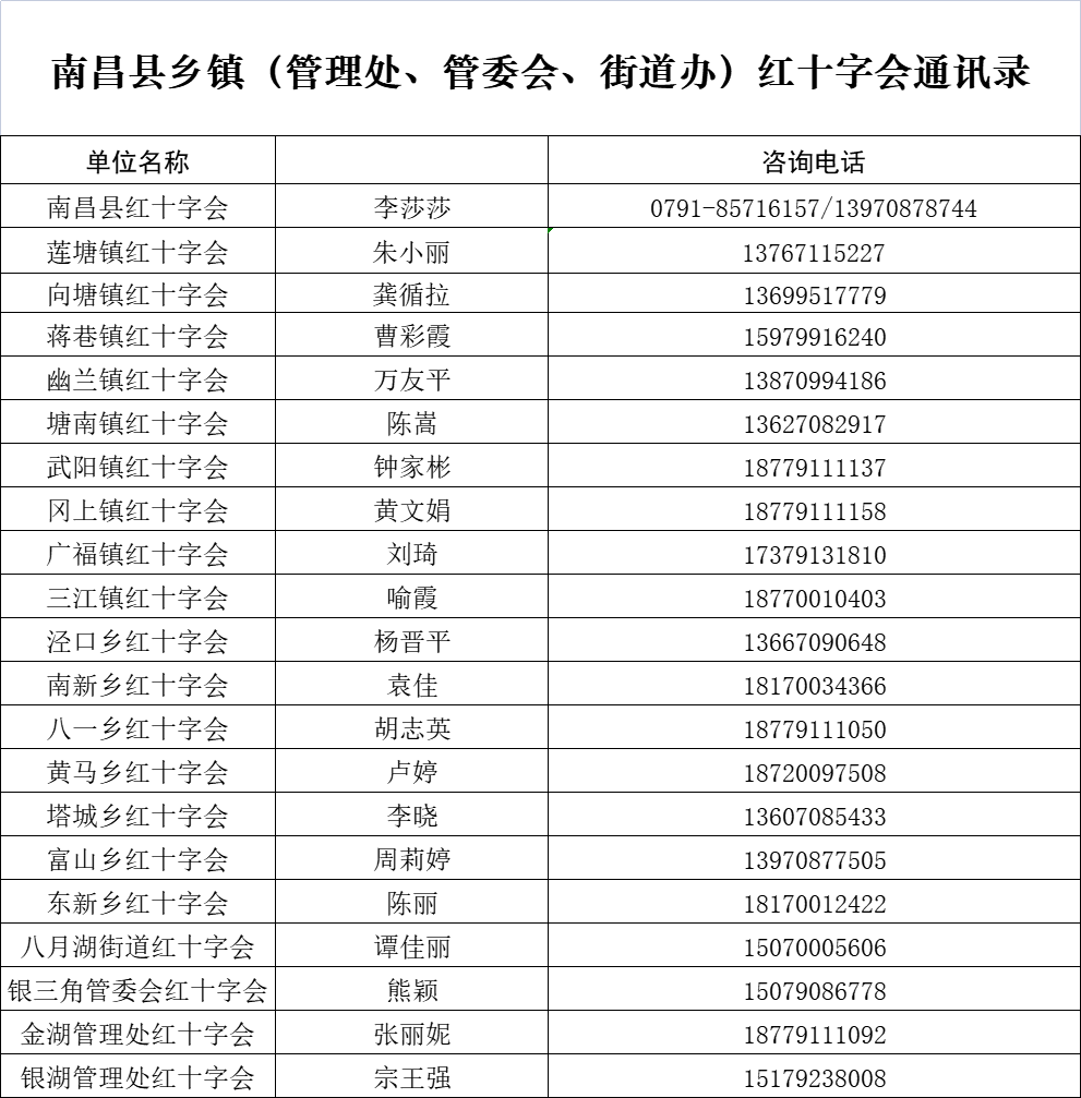 南昌縣紅十字會聯(lián)系方式:0791-85716157,南昌縣蓮塘鎮(zhèn)五一路458號815室。同時,南昌縣所有鄉(xiāng)鎮(zhèn)已成立基層紅十字會,登記事項均可在鄉(xiāng)鎮(zhèn)便民服務(wù)中心紅十字服務(wù)窗口完成。